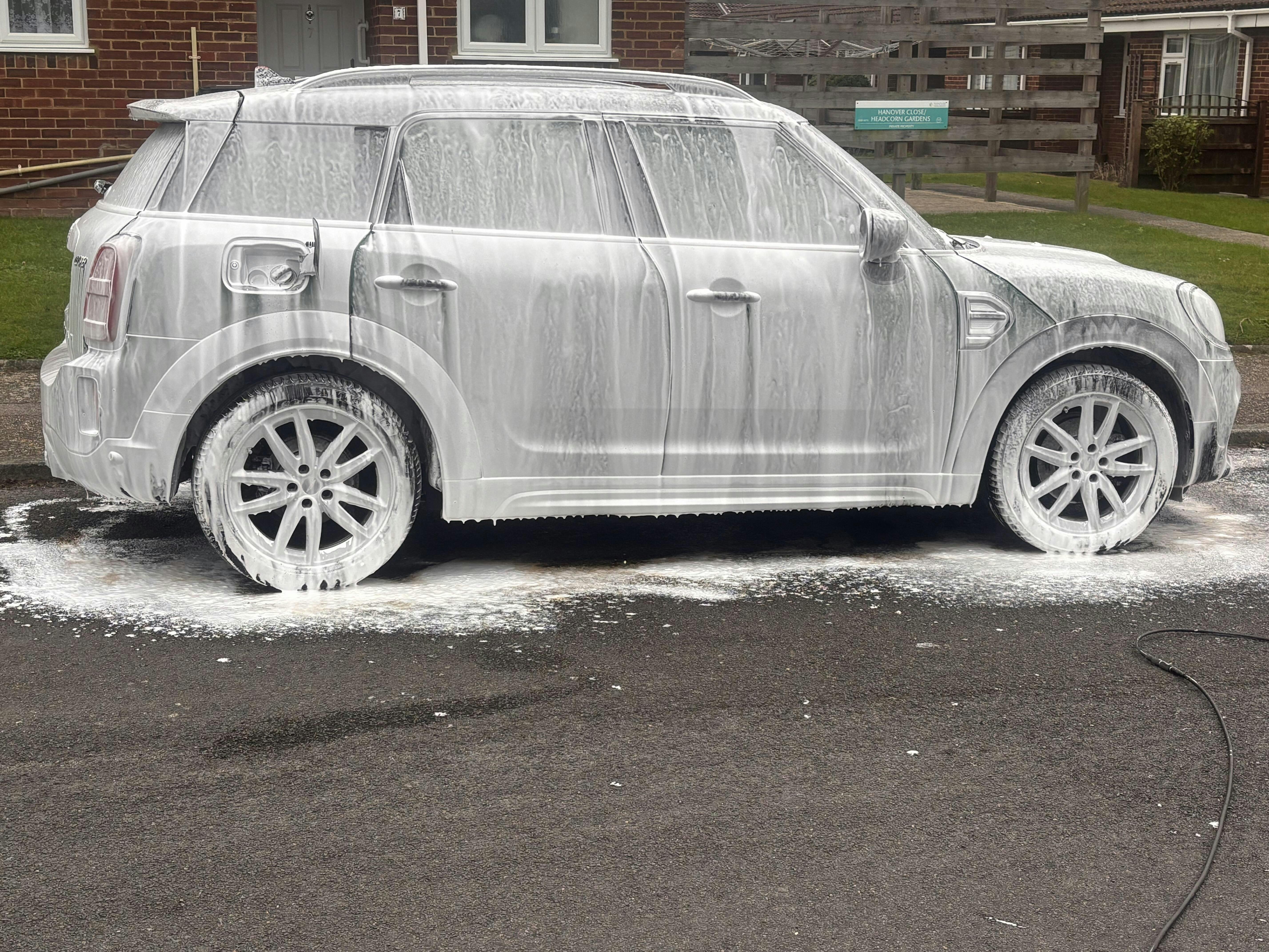 - The cleaner will begin to loosen dirt on all surfaces. For the most thorough clean we recommend agitating the foam with a sponge or wash mitt.
